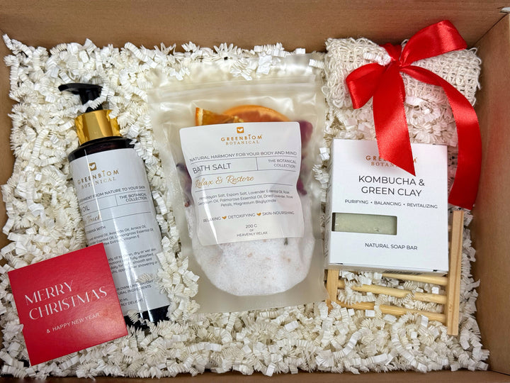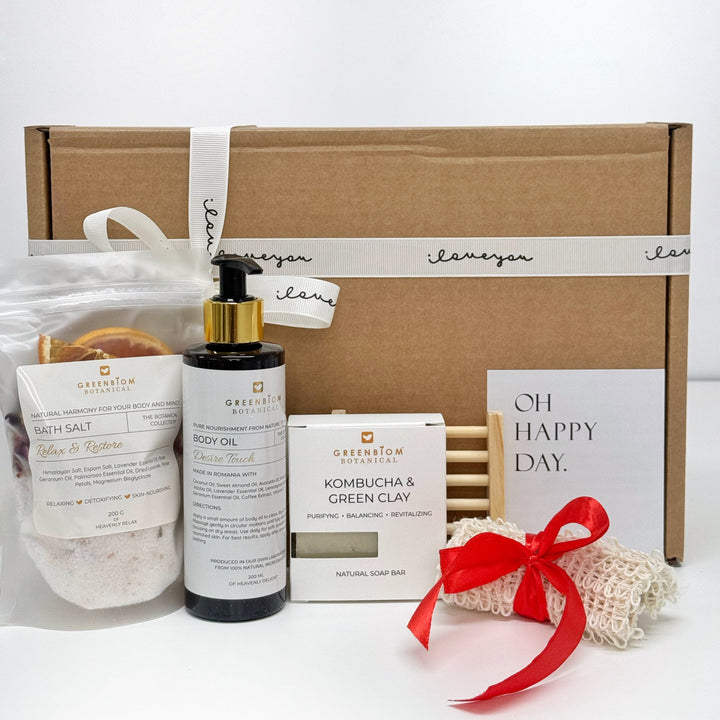Transformă orice seară într-un ritual complet de relaxare. Boxul include o sare de baie aromată cu uleiuri esențiale, plante și fructe uscate, un ulei de corp hrănitor pentru hidratare intensă, și un săpun natural artizanal creat pentru curățare blândă și catifelare.